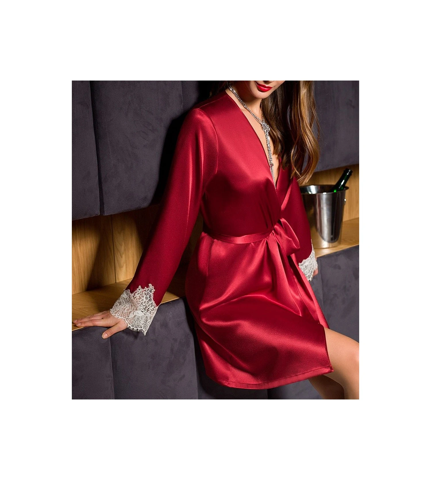 Un joli déshabillé rouge grenat arrivant à mi-cuisse. Les poignets sont ornés d’une dentelle délicate beige.