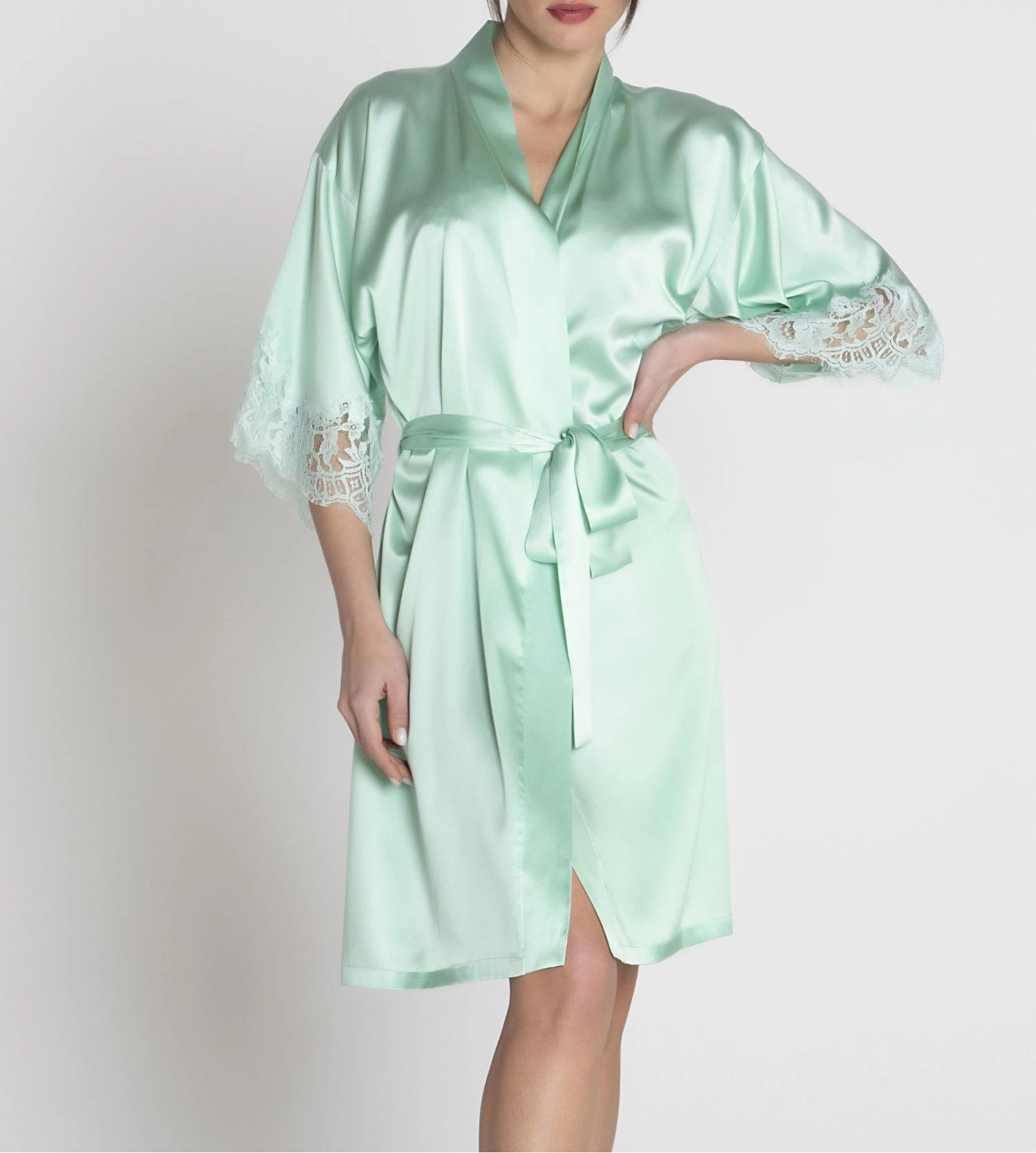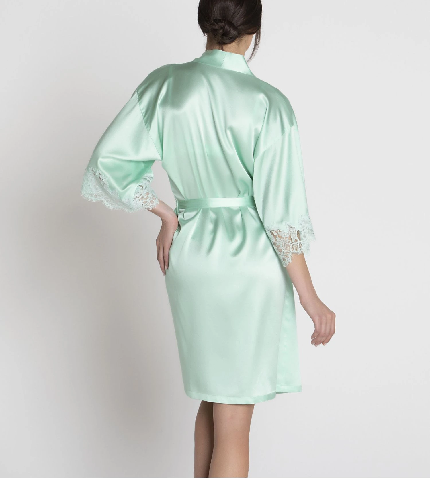 - Robe de chambre en Soie délicatement incrusté de dentelle fine.