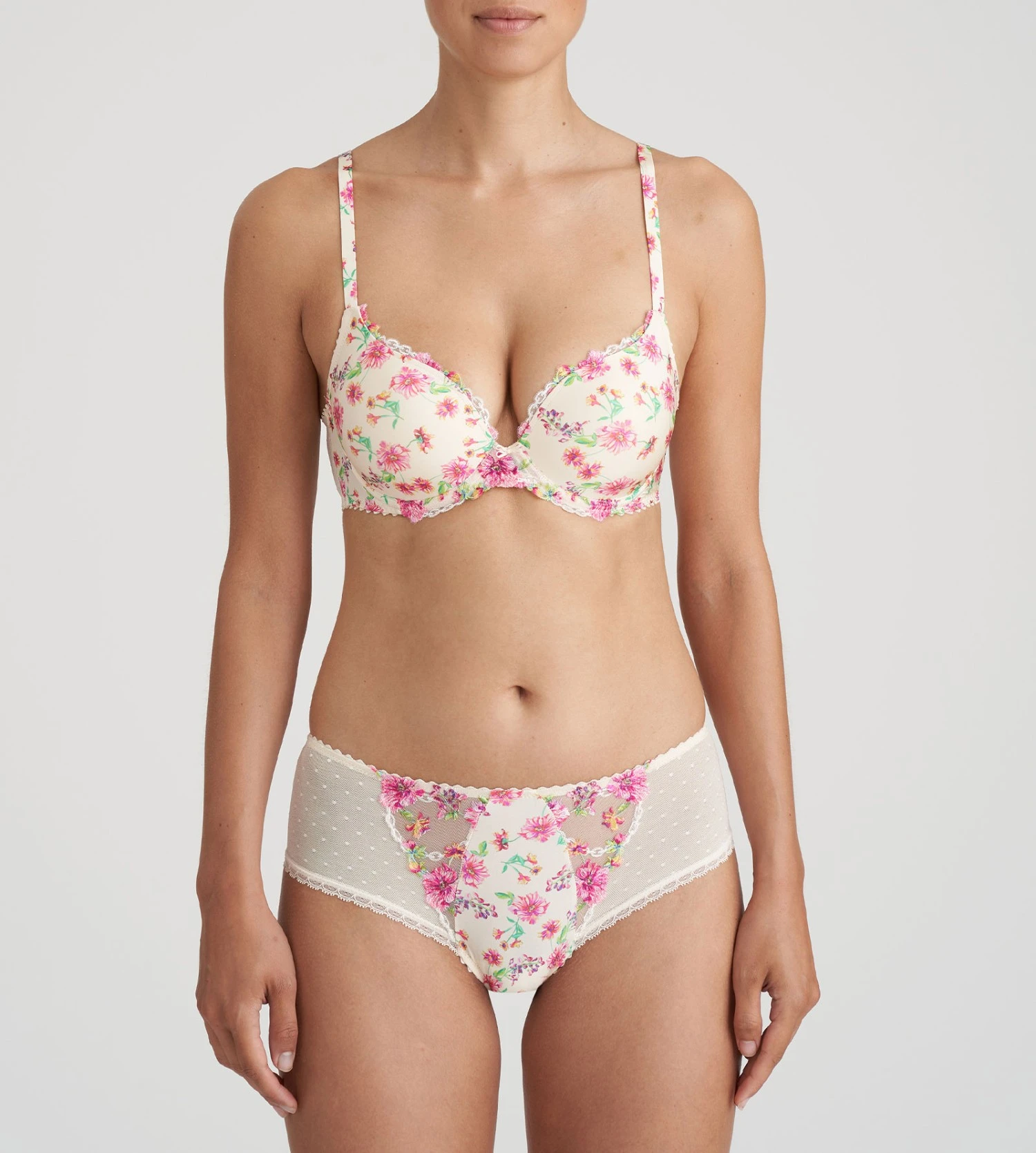 Chen : Romantique avec un petit cĂ´tĂ© funky. DĂ©couvrez une sĂ©rie de lingerie Ă la fois riche et lĂ©gère, oĂą chaque dĂ©tail compte. Avec son imprimĂ© floral joyeux sur une broderie raffinĂ©e, c’est le coup de foudre immĂ©diat ! Les couleurs vives des fleurs donnent une petite touche estivale Ă votre look. Elles se combinent Ă©lĂ©gamment avec le nacrĂ© et le rose clair.