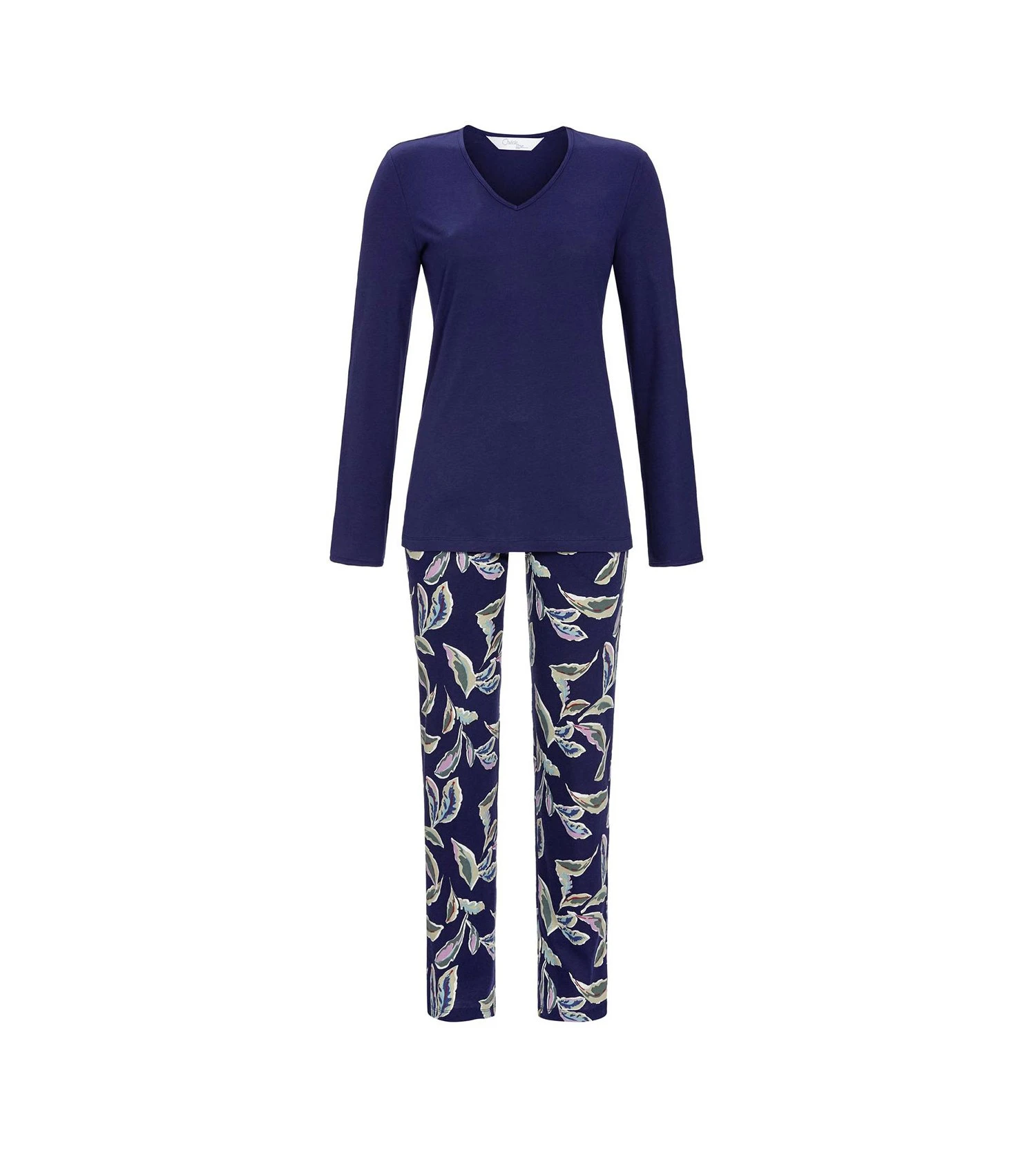 Le pyjama est constitué d’un haut uni et d’un pantalon à motif feuillage abstrait.