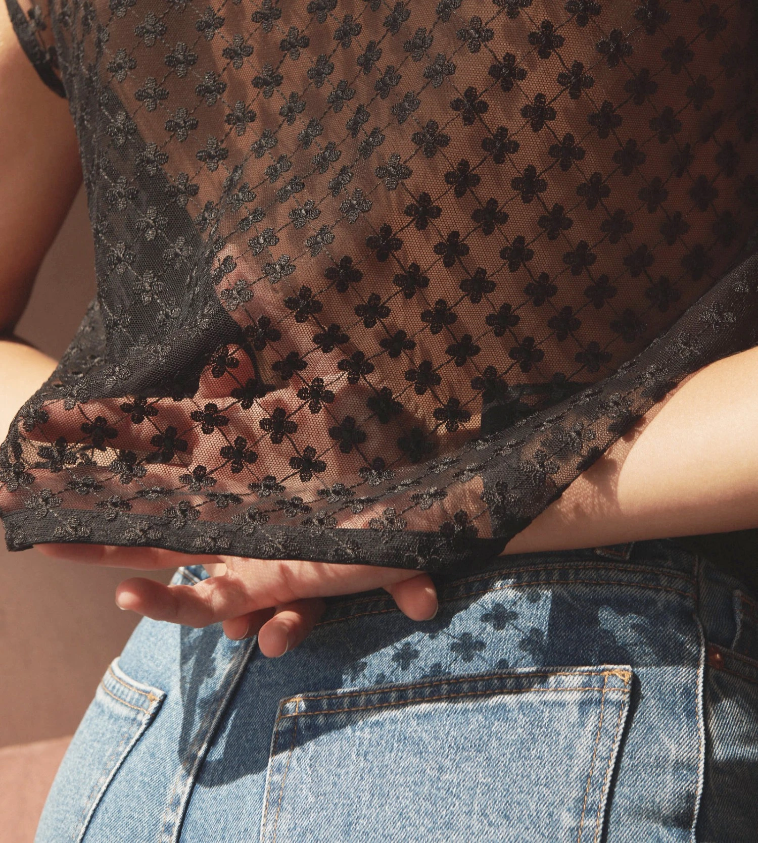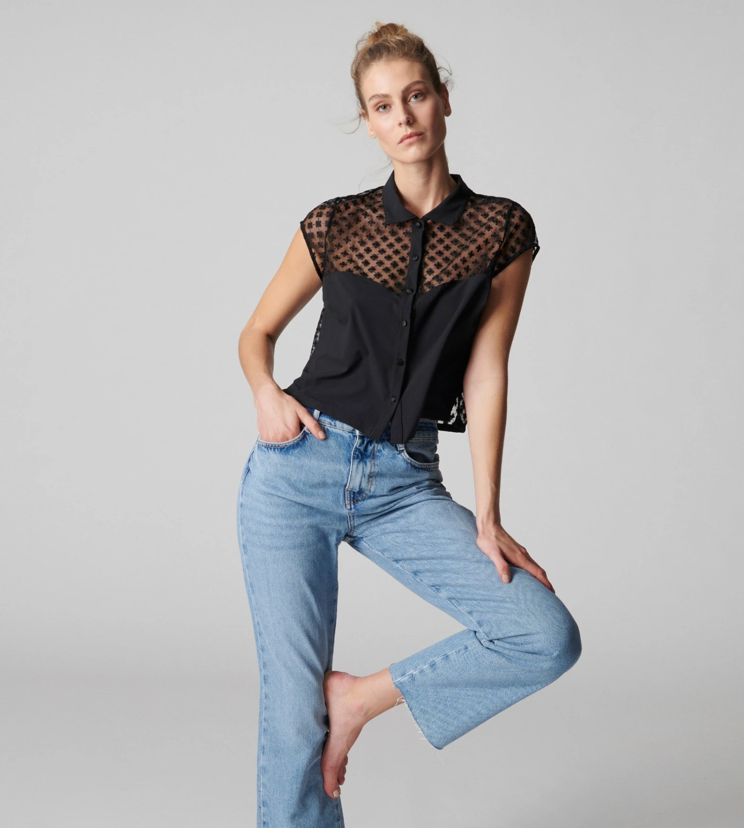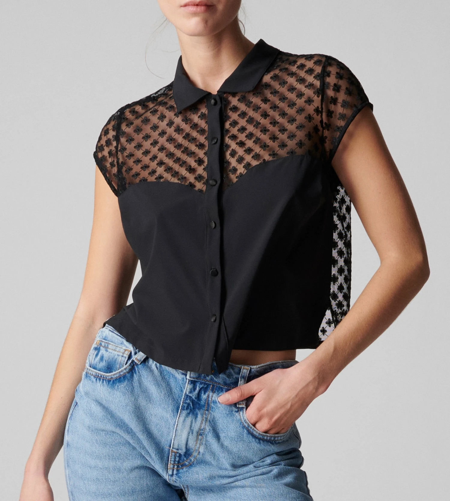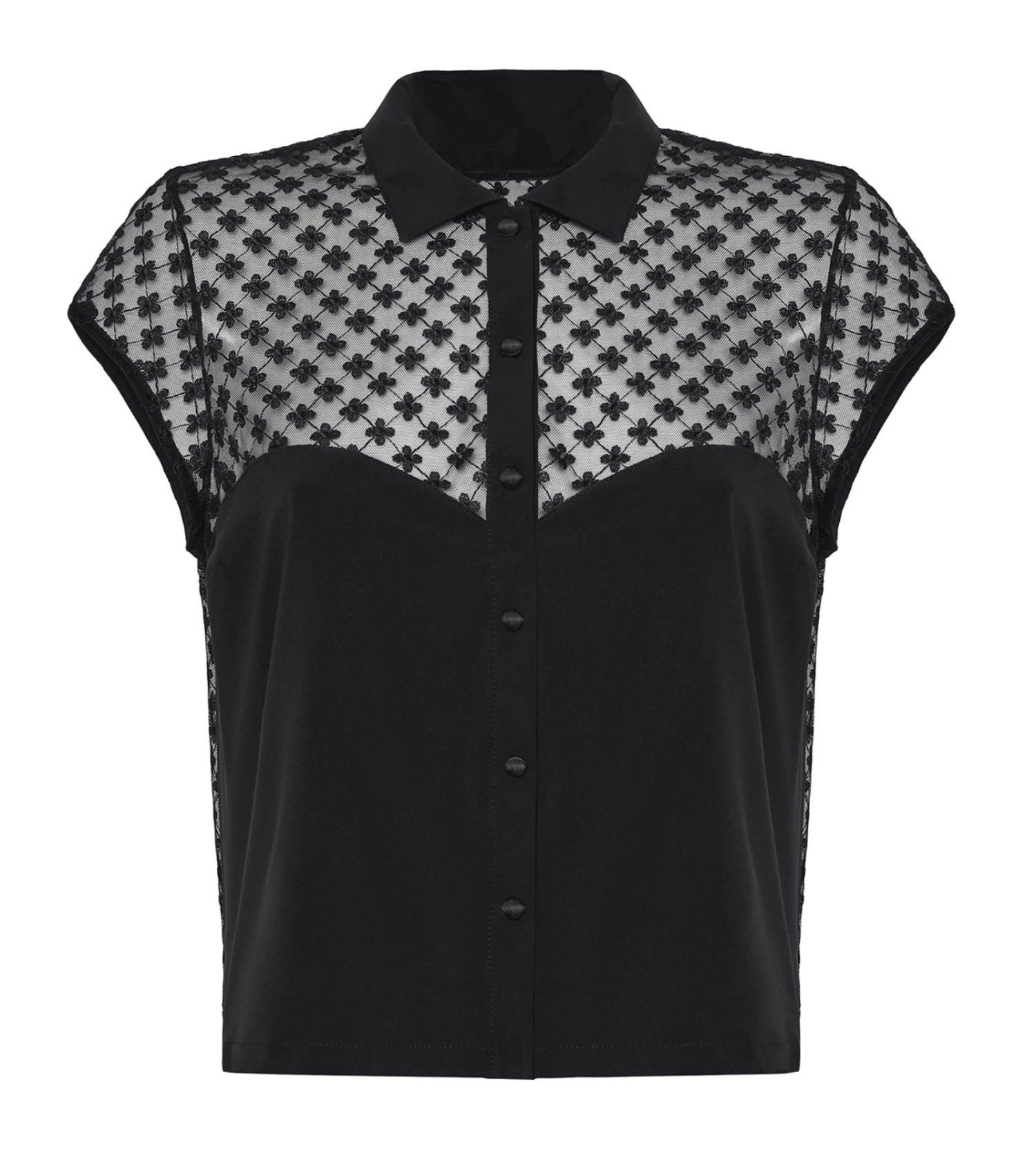 - Chemise courte en crêpe et tulle transparent brodé de fleurs.